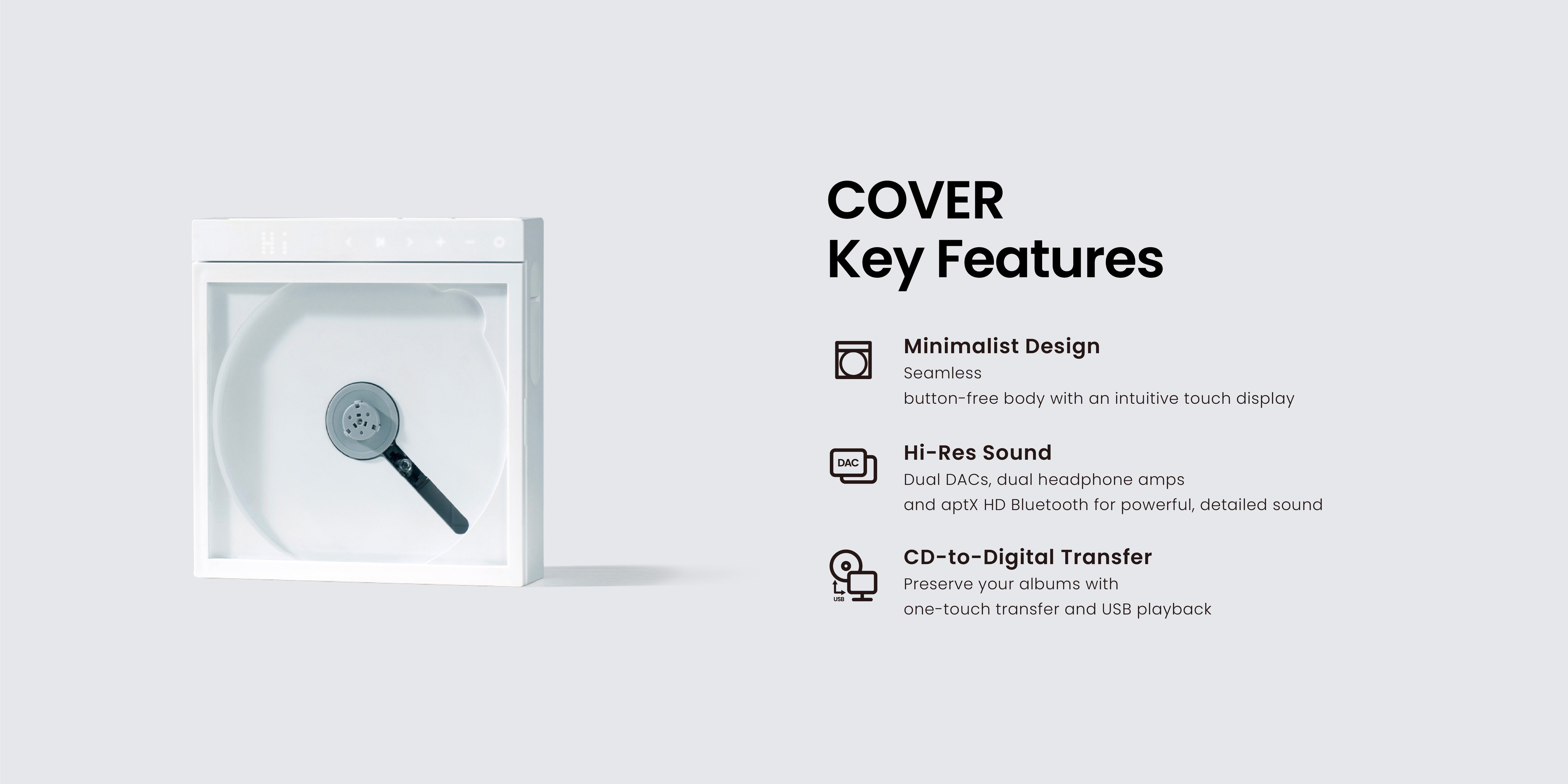 COVER is a high-resolution portable CD player designed for pure listening. Powered by dual DACs, dual headphone amplifiers, and Qualcomm aptX HD Bluetooth, it delivers exceptional clarity whether wired or wireless. Beyond CDs, it also lets you transfer music to your computer and play files directly from USB.