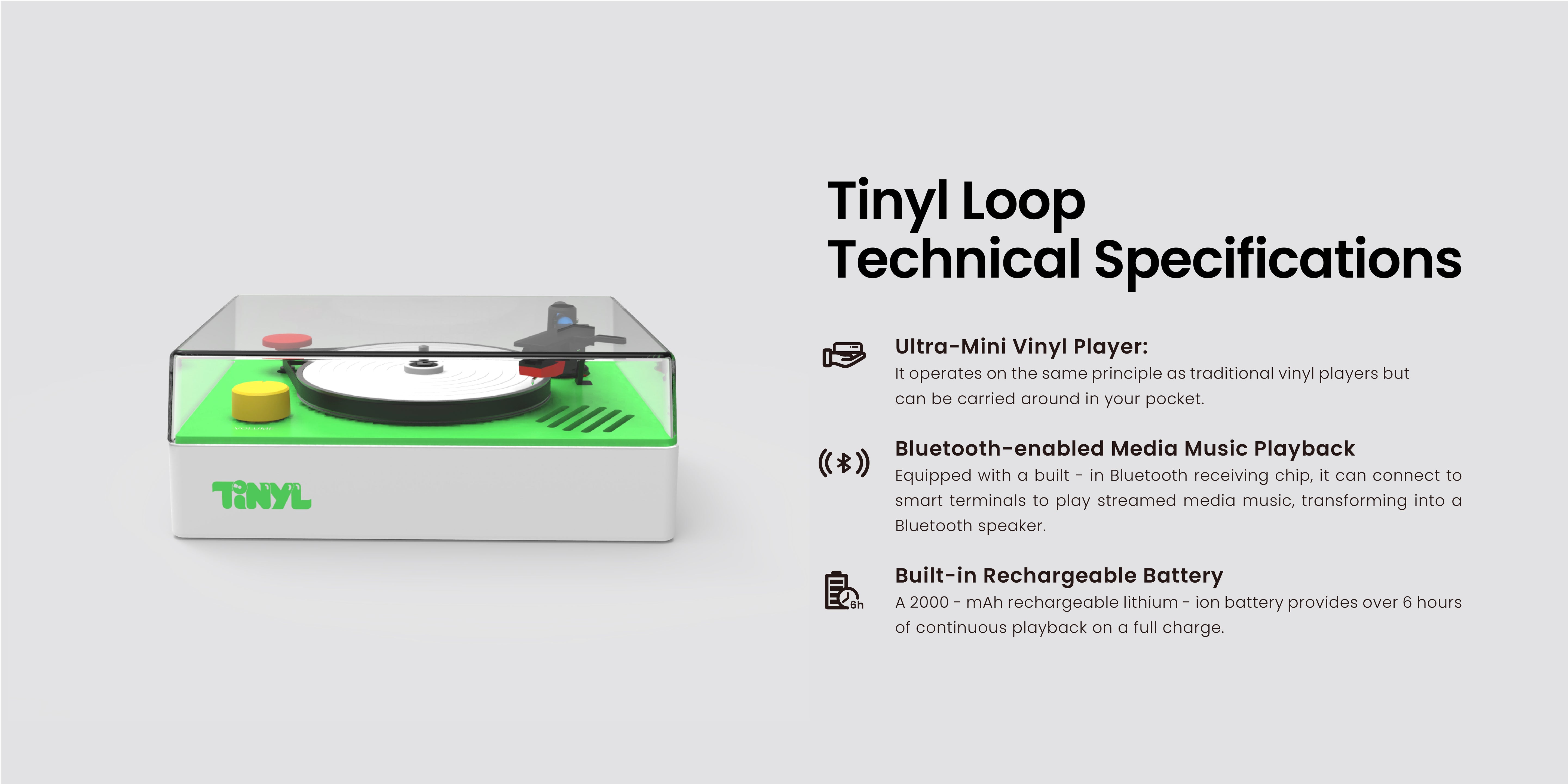 I'm absolutely in love with my TINYL loop! Its compact size fits perfectly on my bedside table, and the sound quality is surprisingly good for such a small device. Playing my 3 - inch mini vinyl records on it feels like a magical journey back to the analog era. Plus, the Bluetooth function comes in handy when I want to stream music from my phone. It's truly a versatile and charming music companion!
