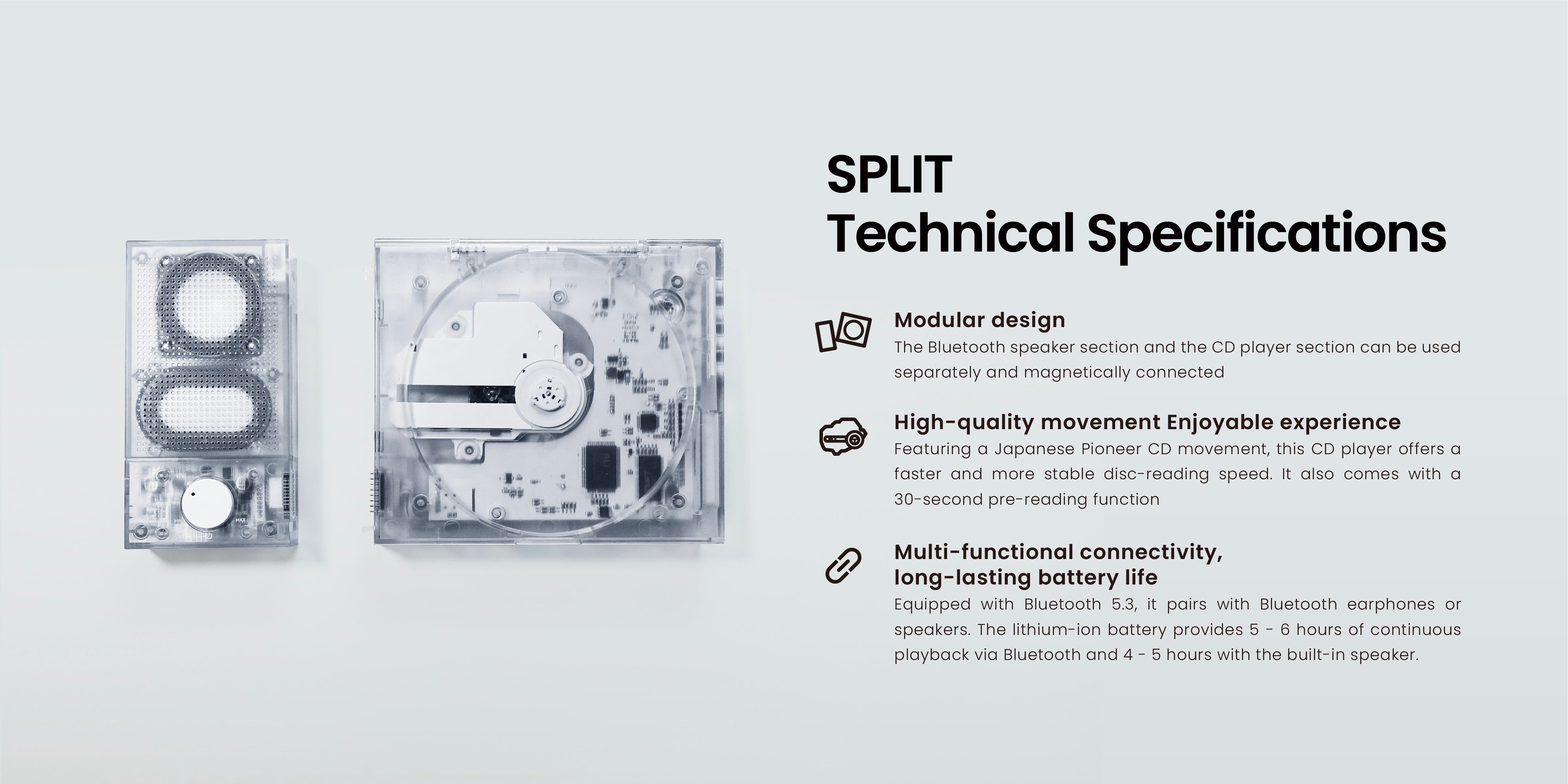 SPLIT uses a Japanese Pioneer CD movement, paired with a 5W full-range speaker and passive bass diaphragm for precise sound and powerful bass. Its two-way Bluetooth 5.3 chip and split design allow both phone music playback and CD streaming to Bluetooth headphones or speakers.