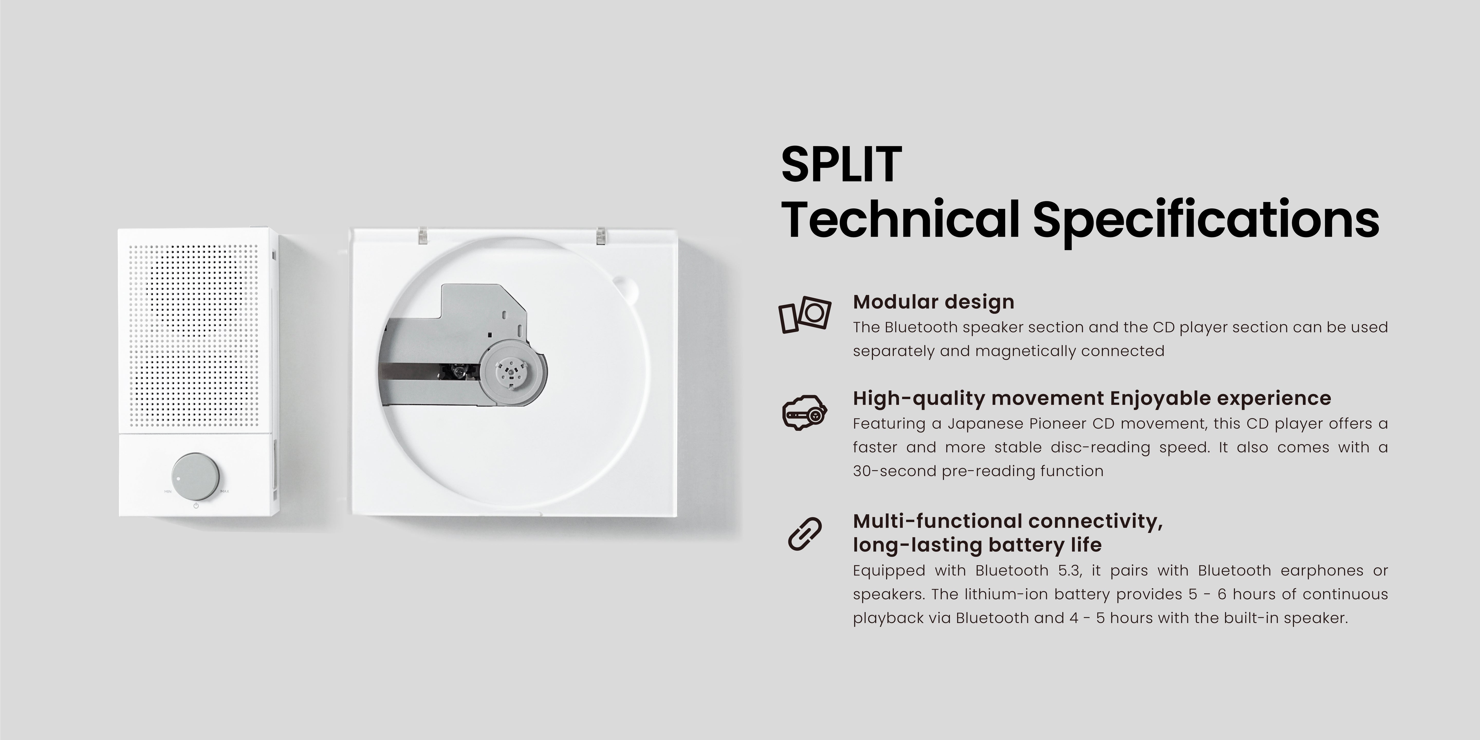 SPLIT uses a Japanese Pioneer CD movement, paired with a 5W full-range speaker and passive bass diaphragm for precise sound and powerful bass. Its two-way Bluetooth 5.3 chip and split design allow both phone music playback and CD streaming to Bluetooth headphones or speakers.