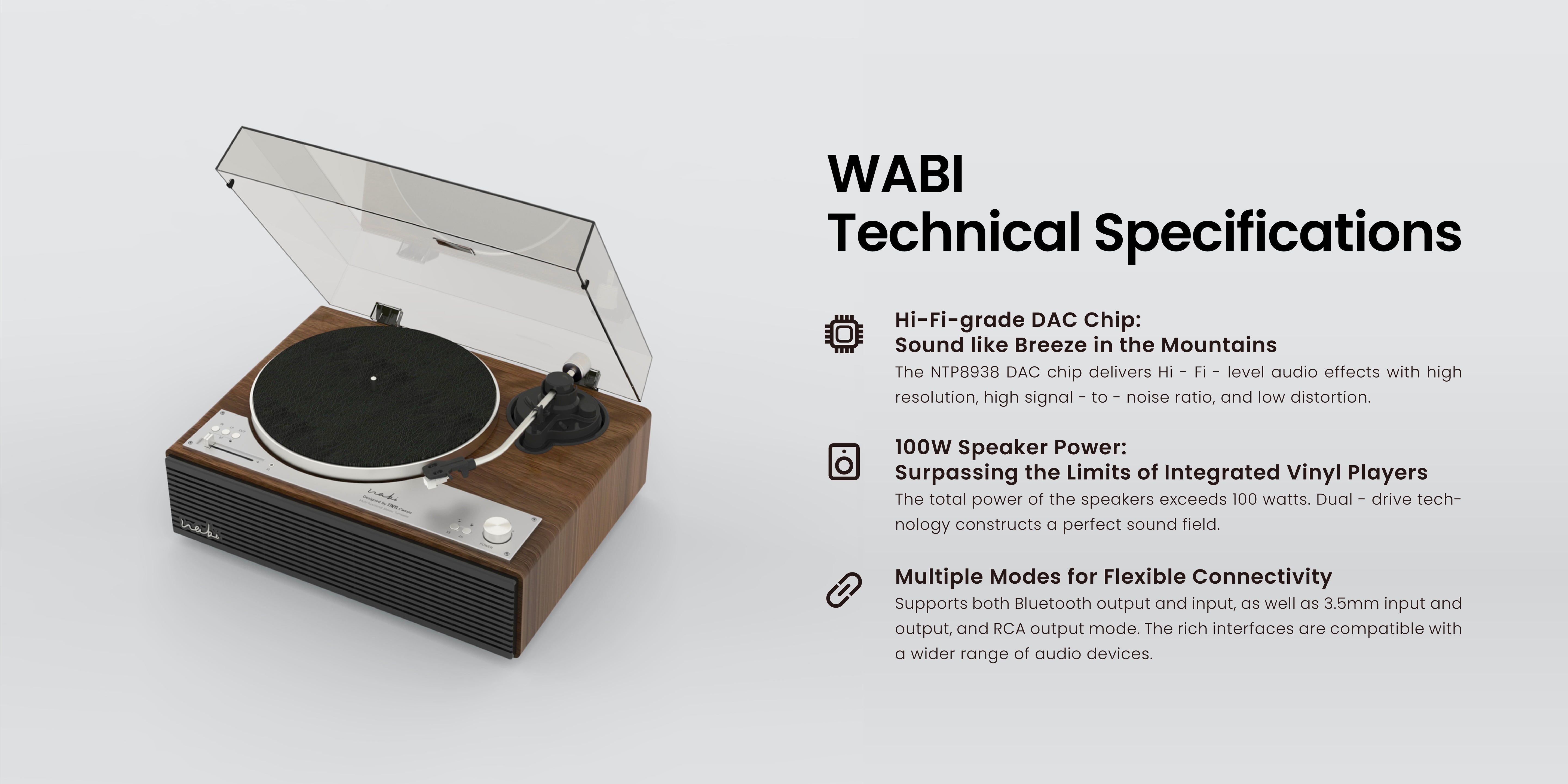 The Wabi turntable is equipped with a Hi - Fi - grade DAC chip, which can deliver audio effects with high resolution, high signal - to - noise ratio, and low distortion. Each note is as clear and moving as flowing water. At the same time, it is equipped with 100W high - power dual - drive speakers, creating a full - bodied sound field that can easily cover a 50 - square - meter space. In addition, the 10 - stage variable - diameter spring suspension shock - absorption design greatly reduces the risk of resonance and needle skipping. The 650g aluminum turntable and high - precision turntable shaft can absorb vibrations and reduce noise, further enhancing the purity and stability of the sound quality and restoring the true musical details.